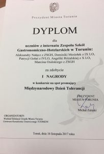 Urząd Miasta Torunia ogłosił konkurs z okazji Miedzynarodowego Dnia Tolerancji. W ramach konkursu nagraliśmy spot filmowy promujący ideę równości, braterstwa i tolerancji. Wychowankowie wraz z wychowawcami zaangażowali się w produkcję. Efektem nasze pracy był spot, który zajął I miejsce. Jesteśmy z niego dumni 🙂